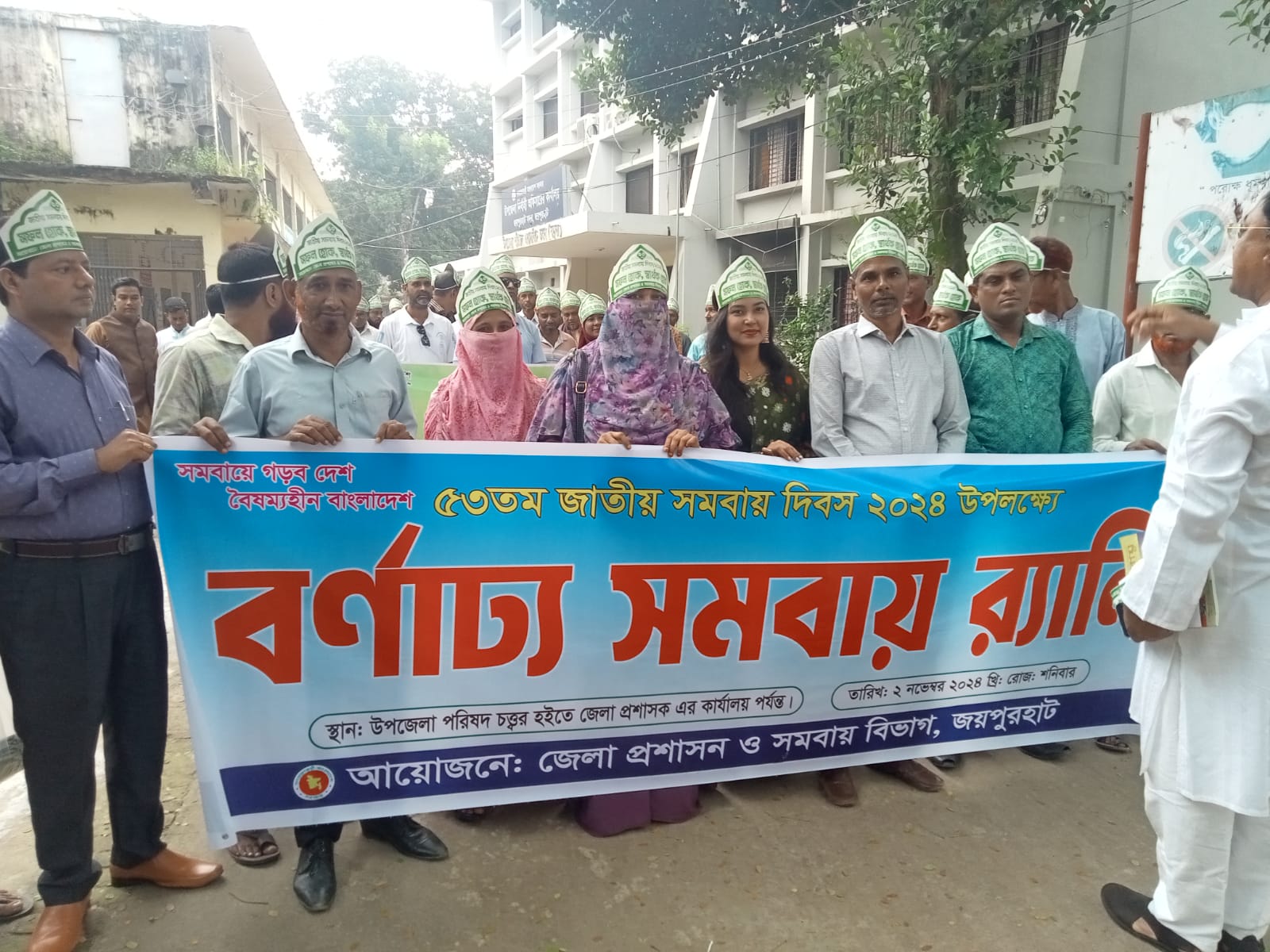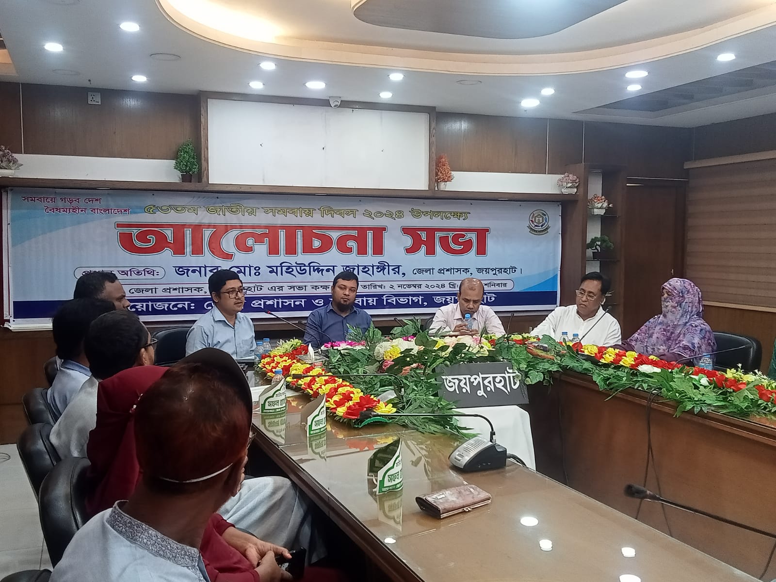 “সমবায়ে গড়বো দেশ, বৈষম্যহীন বাংলাদেশ” এই প্রতিপাদ্যকে সামনে রেখে সমবায় বিভাগ,জয়পুরহাট ও স্থানীয় সমবায়ীদের যৌথ উদ্যোগে গত ০২ নভেম্বর,২০২৪, রোজ শনিবার জয়পুরহাটে ৫৩ তম জাতীয় সমবায় দিবস উদযাপিত হয়েছে। এ উপলক্ষে জয়পুরহাট সদর উপজেলা পরিষদ হতে বর্নাঢ্য সমবায় র্যালী শুরু হয়ে জেলা প্রশাসক কার্যালয়,জয়পুরহাটে শেষ হয়। জেলা প্রশাসক সম্মেলন কক্ষ,জয়পুরহাটে সমবায়ী সমাবেশ ও এক আলোচনা সভা অনুষ্ঠিত হয়েছে। উক্ত আলোচনা সভায় প্রধান অতিথি হিসাবে উপস্থিত ছিলেন জনাব মোঃ মহিউদ্দিন জাহাঙ্গীর,জেলা প্রশাসক,জয়পুরহাট মহোদয়। সভায় বিশেষ অতিথি হিসাবে উপস্থিত ছিলেন জনাব বিপুল কুমার,অতিরিক্ত জেলা প্রশাসক (সার্বিক),জয়পুরহাট, জনাব মোঃ রাশেদুল ইসলাম,উপজেলা নির্বাহী অফিসার,জয়পুরহাট সদর,জয়পুরহাট মহোদয় । এছাড়া উক্ত অনুষ্ঠানে উপস্থিল ছিলেন জনাব মোঃ মর্জিনা বেগম,উপজেলা সমবায় অফিসার,জয়পুরহাট সদর,জয়পুরহাট এবং অত্র দপ্তরের কর্মচারীবৃন্দ ও সমবায়ীবৃন্দ। উক্ত অনুষ্ঠানে সভাপতিত্ব করেন জনাব এ্যাডভোকেট শাহ্ আখতারুজ্জামান বাবু,জয়পুরহাট সদর,জয়পুরহাট।